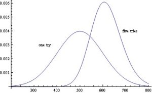 The latest college-bound craze? Do-overs on your SATs. This would be OK if the College Board folks also reported how many times you took the test. Then we could just use the distribution of the maximum score (this is an example of an order statistic). Look at the difference between the (normal) distribution of a single attempt, and the highly skewed distribution of the best of five attempts: