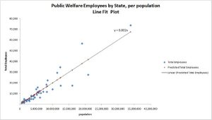 I ran a simple regression which suggests a zero intercept, and an average of 199.5 employees per 100,000 residents. The big outliers are New York, Texas, and Florida. Of course, the last two are below the regression line… That point up at the top is California. Last year I noted that they have a national plurality of welfare recipients.