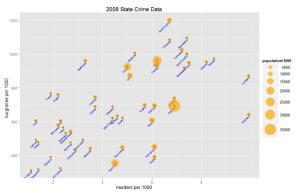 main="2008 State Crime Data", xlab="murders per 1000", ylab="burglaries per 1000") +